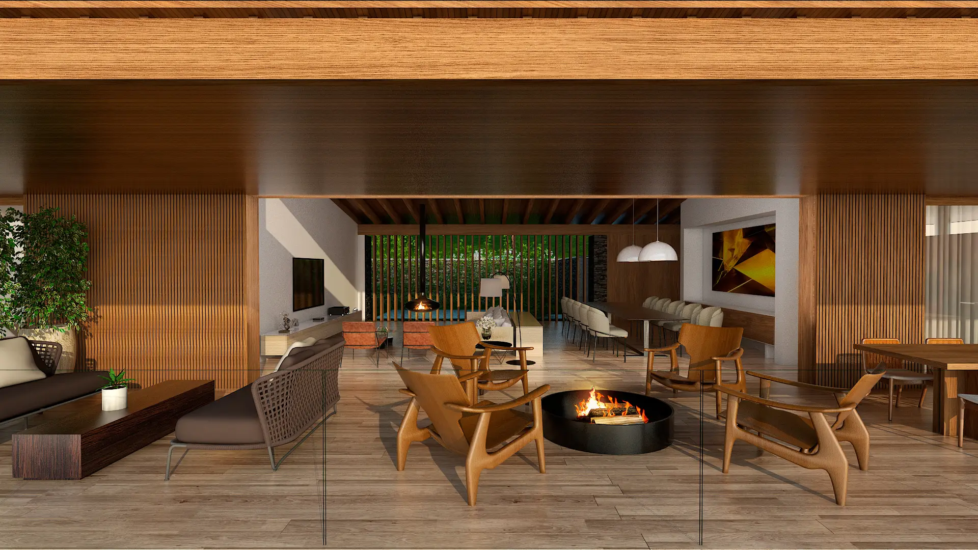 As fachadas em vidro e as aberturas generosas não só permitem a entrada abundante de luz natural como também promovem a integração das áreas interiores e exteriores em um conceito só.